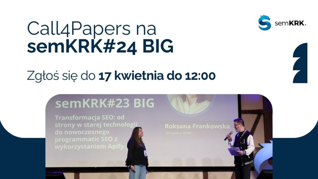 2) Weź udział w Call4Papers i skorzystaj z zaproszenia, jeśli Twój temat zajmie drugie miejsce w danej kategorii (podczas semKRK#21 BIG po raz pierwszy zorganizowaliśmy wystąpienia w formie SPRINT na których podczas 10 minut zaprezentowali się prelegenci, którzy zajęli 2 miejsca w swoich kategoriach i tak będzie również podczas tej edycji),